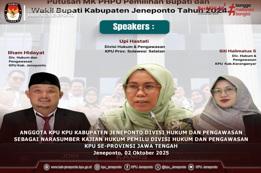 #TemanPemilih-Anggota KPU Kabupaten Jeneponto Divisi Hukum dan Pengawasan, Ilham Hidayat sebagai narasumber pada Kajian Hukum Pemilu Divisi Hukum dan Pengawasan KPU Se-Provinsi Jawa Tengah Secara Daring. Kamis (02/10/2025) Kegiatan ini dilaksanakan sebagai forum pembelajaran, berbagi pengalaman, serta memperkuat kapasitas kelembagaan penyelenggara pemilu dalam bidang hukum dan pengawasan. Dalam kesempatan tersebut, Anggota KPU Kabupaten Jeneponto memaparkan praktik dan strategi yang telah dilakukan dalam mendukung penegakan hukum pemilu, termasuk upaya pencegahan dan pengawasan partisipatif. Melalui kegiatan ini diharapkan tercipta sinergi antar-KPU kabupaten/kota dan provinsi di seluruh Indonesia, khususnya dalam penguatan pemahaman hukum serta peningkatan kualitas pengawasan demi mewujudkan pemilu yang berintegritas. Dalam kesempatan tersebut, narasumber memaparkan berbagai strategi dan praktik terbaik yang telah dilaksanakan dalam mendukung penegakan hukum pemilu, termasuk penguatan pencegahan pelanggaran serta peran pengawasan partisipatif masyarakat. Kegiatan ini bertujuan untuk memperluas wawasan, membangun sinergi antar-KPU provinsi dan kabupaten/kota, serta memperkuat kapasitas kelembagaan di bidang hukum dan pengawasan. Melalui forum kajian hukum ini, diharapkan terwujud penyelenggaraan pemilu yang berintegritas, transparan, dan akuntabel. #KPUMelayani ....