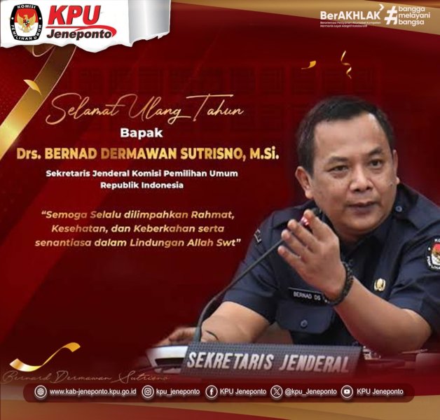 #TemanPemilih-Segenap jajaran Komisi Pemilihan Umum (KPU) Kabupaten Jeneponto mengucapkan Selamat Ulang Tahun Bapak Bernad Dermawan Sutrisno Sekretaris Jenderal KPU RI, Semoga selalu dilimpahkan rahmat, kesehatan dan keberkahan serta senangtiasa dilindungan Allah SWT...Aamiin #KPUMelayani ....