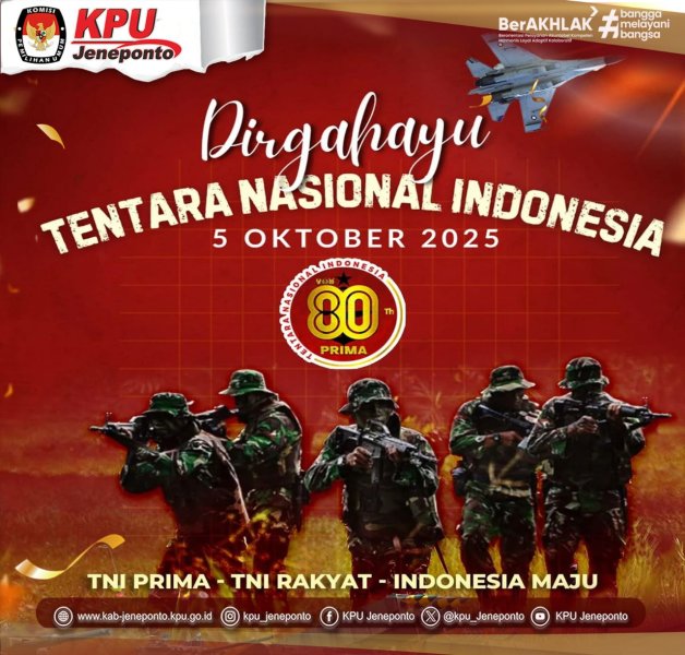 #TemanPemilih-Segenap jajaran Komisi Pemilihan Umum (KPU) Kabupaten Jeneponto mengucapkan Selamat Dirgahayu Tentara Nasional Indonesia yang ke 80 Tahun 2025. Semoga dengan tema "TNI Prima, TNI Rakyat, Indonesia Maju," TNI selalu menjadi garda terdepan dalam menjaga kedaulatan, keamanan, dan persatuan Indonesia. #KPUMelayani ....