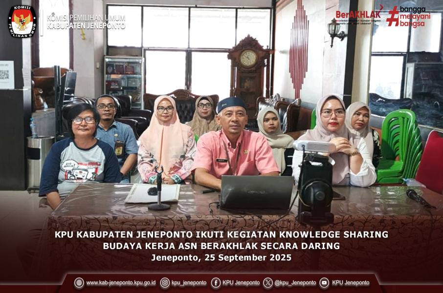 #TemanPemilih-Komisi Pemilihan Umum (KPU) Kabupaten Jeneponto berpartisipasi dalam kegiatan Knowledge Sharing Budaya Kerja ASN BerAKHLAK yang diselenggarakan oleh KPU RI secara daring. Kamis (25/09/2025).