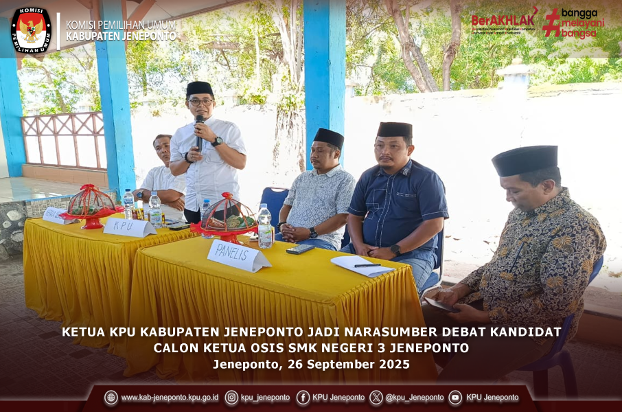 #TemanPemilih- Ketua Komisi Pemilihan Umum (KPU) Kabupaten Jeneponto, Asming. S, didampingi Kordinator Divisi Parmas dan SDM, Hasrullah Hafid, Kordinator Divisi Hukum, Ilham Hidayat hadir sebagai narasumber pada kegiatan Debat Kandidat Calon Ketua OSIS SMK Negeri 3 Jeneponto. Jumat (26/09/2025).