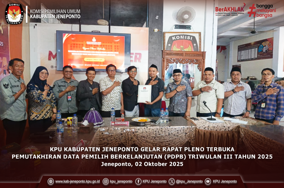 Berikut hasil Keputusan Rapat Pleno KPU Kabupaten Jeneponto menetapkan hasil Rekapitulasi Pemutakhiran Data Pemilih Berkelanjutan (PDPB) Triwulan III Tahun 2025 sebanyak 296.686 pemilih yakni Laki-Laki 143.551 pemilih, Perempuan 153.135 Pemilih yang tersebar di 11 Kecamatan, 113 Desa/Kelurahan.