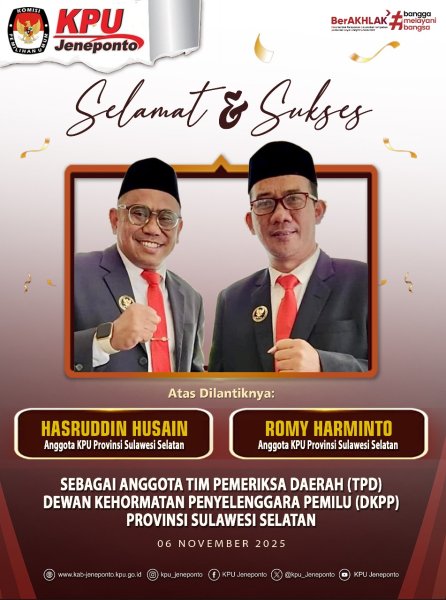 #TemanPemilih-Segenap Jajaran KPU Kabupaten Jeneponto mengucapkan Selamat dan Sukses atas dilantiknya bapak Hasruddin Husain dan Romy Harminto sebagai anggota Tim Pemeriksa Daerah (TPD) Dewan Kehormatan Penyelenggara Pemilu (DKPP) Provinsi Sulawesi Selatan.