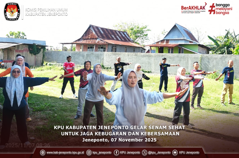 #TemanPemilih-Komisi Pemilihan Umum (KPU) Kabupaten Jeneponto menggelar kegiatan senam sehat yang diikuti oleh seluruh jajaran sekretariat, serta staf di lingkungan KPU Kabupaten Jeneponto. Kegiatan ini berlangsung di halaman kantor KPU Jeneponto dengan penuh semangat dan antusiasme. Jumat (07/11/2025)