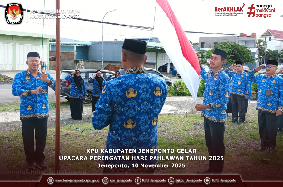 #TemanPemilih- Komisi Pemilihan Umum (KPU) Kabupaten Jeneponto melaksanakan upacara memperingati Hari Pahlawan Tahun 2025 yang mengusung tema “Pahlawanku Teladanku, Terus Bergerak Melanjutkan Perjuangan”, pada Senin, 10 November 2025, di halaman kantor KPU Kabupaten Jeneponto.