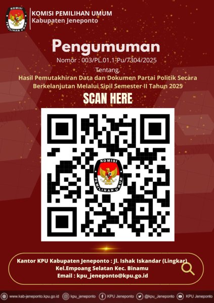 #TemanPemilih-Komisi Pemilihan Umum (KPU) Kabupaten Jeneponto menyampaikan pengumuman hasil Pemutakhiran Data dan Dokumen Partai Politik secara Berkelanjutan Melalui Sipol Semester II Tahun 2025.