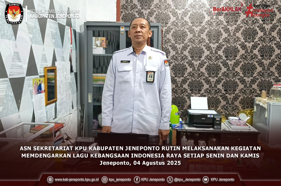#TemanPemilih-Dalam rangka menumbuhkan semangat kebangsaan dan memperkuat rasa cinta tanah air, Aparatur Sipil Negara (ASN) di lingkungan KPU Kabupaten Jeneponto melaksanakan kegiatan mendengarkan lagu kebangsaan Indonesia Raya pada hari Senin, 04 Agustus 2025.