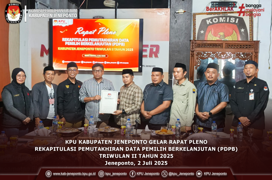 Berikut hasil Keputusan Rapat Pleno KPU Kabupaten Jeneponto menetapkan hasil Rekapitulasi Pemutakhiran Data Pemilih Berkelanjutan (PDPB) Triwulan II Tahun 2025 sebanyak 291.676 pemilih yakni Laki-Laki 141.123 pemilih, Perempuan 150.553 Pemilih yang tersebar di 11 Kecamatan, 113 Desa/Kelurahan.