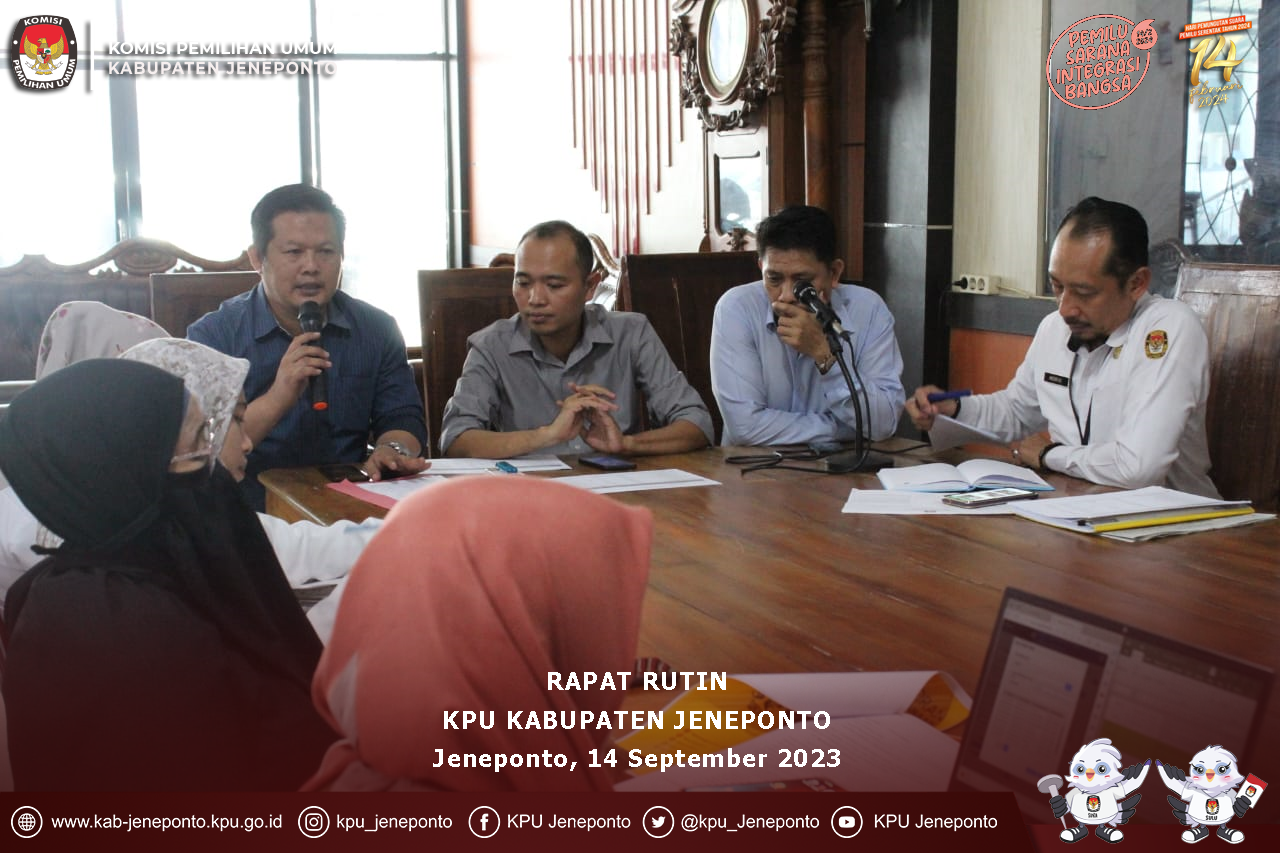 #TemanPemilih-Komisi Pemilihan Umum Kabupaten Jeneponto gelar rapat rutin dengan agenda evaluasi dan rencana kerja masing-masing Divisi atau Sub Bagian yang dilaksanakan di Aula KPU Kabupaten Jeneponto, Kamis (14/9/2023)