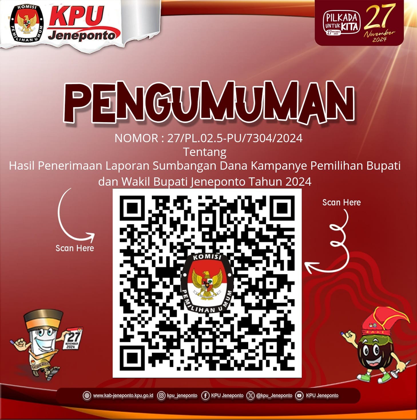 #Teman Pemilih, Komisi Pemilihan Umum Kabupaten Jeneponto mengumumkan Hasil Penerimaan Laporan Penerimaan Sumbangan Dana Kampanye Pasangan Calon Bupati dan Wakil Bupati Jeneponto Tahun 2024.
