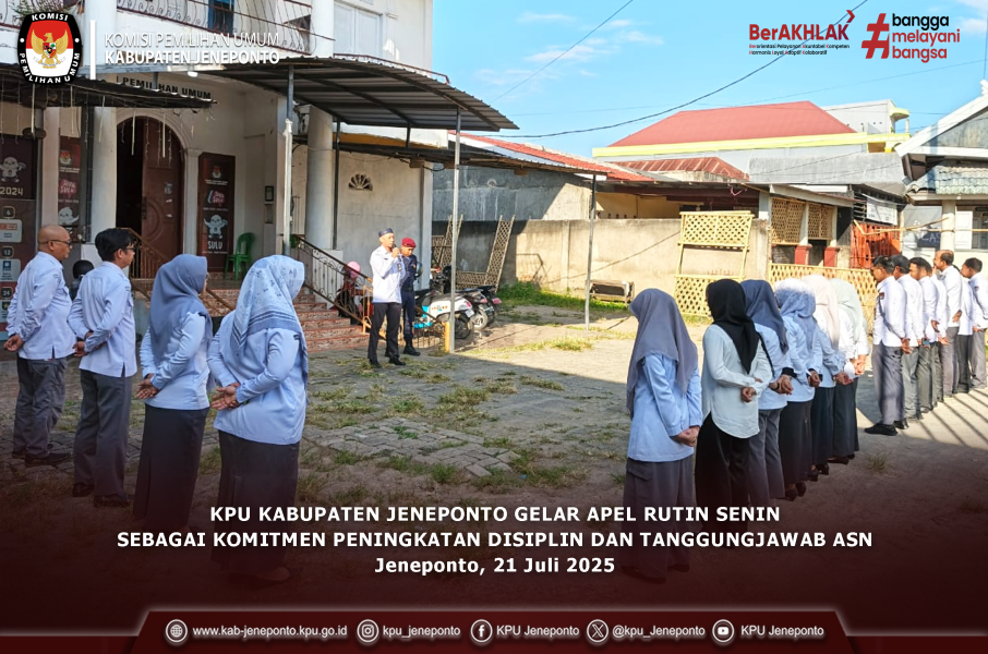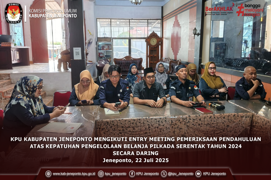 #TemanPemilih-Dalam rangka mendukung terwujudnya tata kelola keuangan yang transparan dan akuntabel, KPU Kabupaten Jeneponto mengikuti kegiatan entry meeting pemeriksaan pendahuluan atas kepatuhan pengelolaan belanja Pilkada Serentak Tahun 2024 yang diselenggarakan secara daring oleh KPU Provinsi Sulawesi Selatan. Selasa (22/07/25).