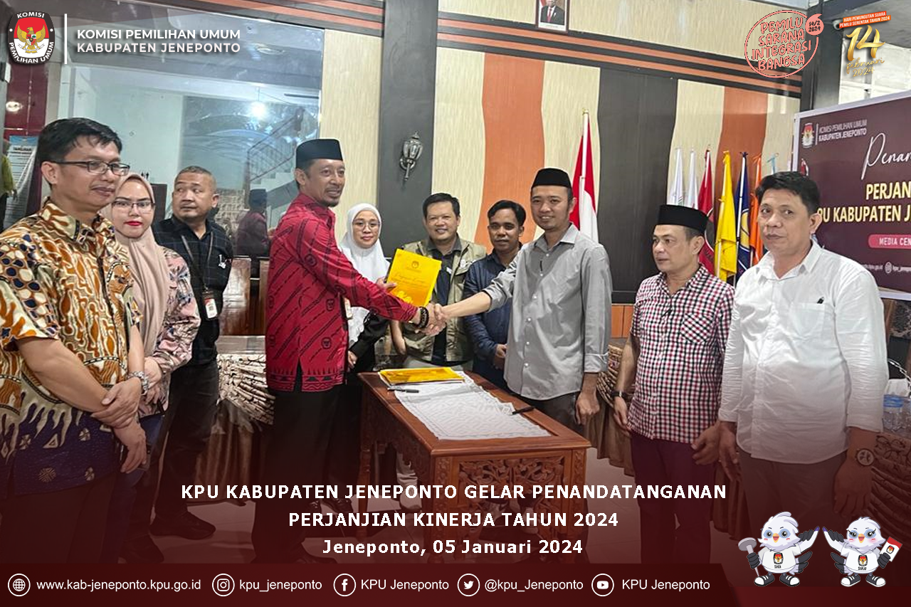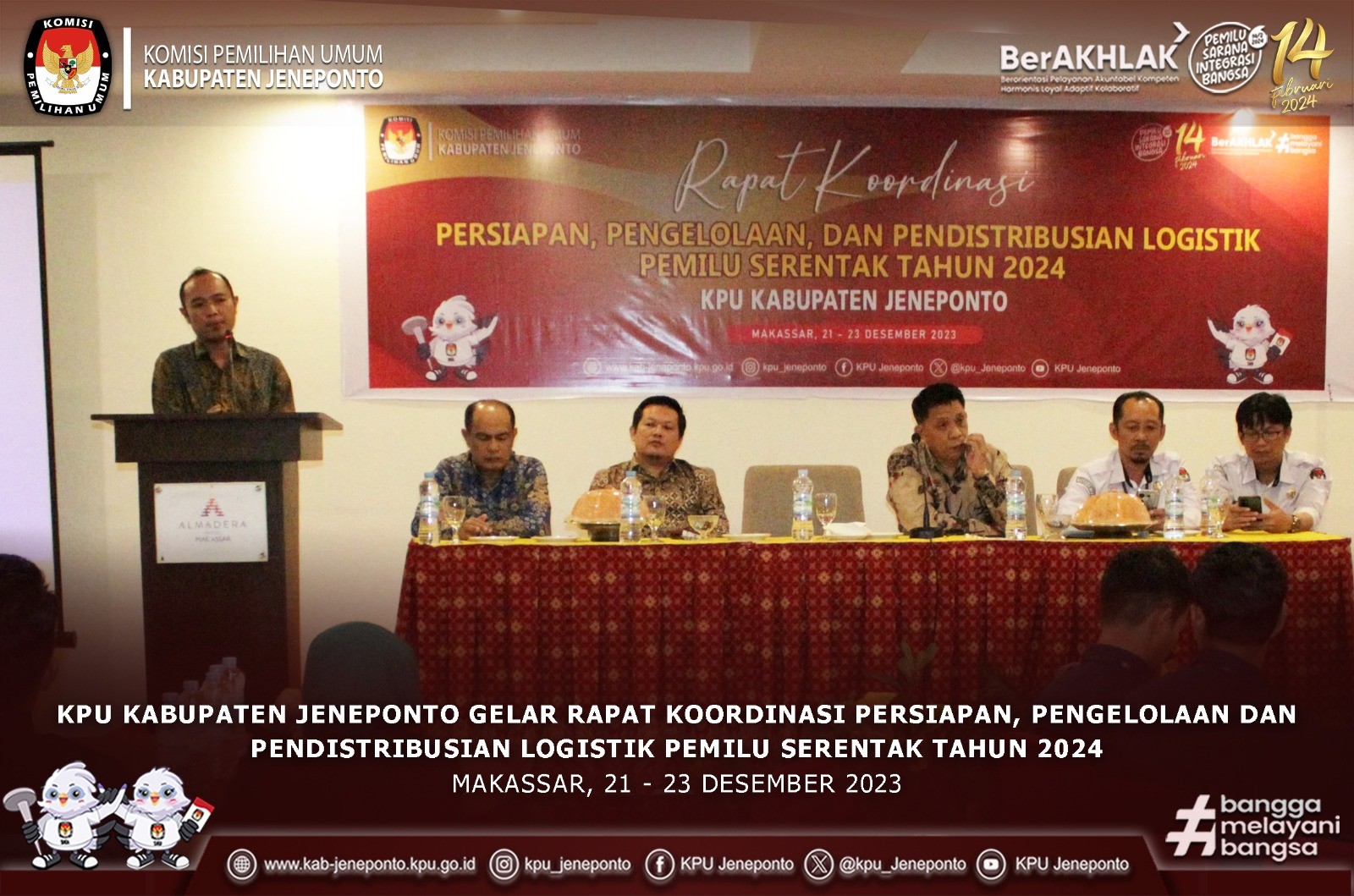 #TemanPemilih-KPU Kabupaten Jeneponto menggelar Rapat Koordinasi Training of Trainers (ToT) bagi PPK dan PPS dalam Bimbingan Teknis Kelompok Penyelenggara Pemungutan Suara (KPPS) untuk Pemilu Tahun 2024 selama dua hari bertempat di ruang pola kantor Bupati Kabupaten Jeneponto. (24/01/2024). Kegiatan ToT ini dilaksanakan dua Gelombang. Gelombang pertama digelar tanggal 23 Januari 2024 dengan peserta Ketua dan Anggota PPK serta Ketua dan Anggota PPS se-Kecamatan Arungkeke, Batang, Tarowang, Binamu, Bangkala, Bangkala Barat. Sementara gelombang ke dua digelar tanggal 24 Januari 2024, dengan peserta Ketua dan Anggota PPK serta Ketua dan Anggota PPS se-Kecamatan Turatea, Kelara, Rumbia, Tamalatea, Bontoramba. Ketua KPU Kabupaten Jeneponto, Sapriadi S menjelaskan, bimbingan teknis terpadu dan ToT terhadap PPK dan PPS pada Bimbingan KPPS dilakukan untuk membina dan menyatukan persepsi serta pemahaman teknis para panitia yang betugas saat pemilu 14 Februari 2024 nanti. Kegiatan ini diharapkan tercipta penyelenggaraan Pemilu yang lebih baik dan berintegritas dari pada gelaran pemilu yang lalu. “Pemilu tinggal menghitung hari lagi. Kegiatan ini agar nanti PPK dan PPS sepemahaman dan mengetahui betul teknis pelaksanaan saat gelaran pemilu 14 Februari nanti, Harapannya untuk semua panitia paham betul tupoksi pada saat hari H. Pahami pola kerja yang baik, dan diharapkan pula PPS melatih seluruh KPPS untuk bekerja dengan baik agar KPPS bekerja sesuai jobdesknya masing-masing”, jelasnya. Sapriadi menambahkan, sebanyak 7.679 KPPS akan dilantik 25 Januari 2024. Untuk Bimbingan Teknis KPPS akan digelar berglombang mulai tanggal 26 hingga 29 Januari 2024. Sementara itu, Pelantikan KPPS dilakukan oleh PPS, PPS diberi mandat oleh KPU melantik KPPS sesuai Desa/Kelurahan. Gelaran pelantikan dijadwalkan serentak 25 Januari 2024 mulai pukul 09.00 wita bertempat di Kantor Desa/Kelurahan masing-masing. Tak hanya itu, sesuai arahan KPU RI nantinya setelah pelantikan KPPS, akan dilakukan penanaman bibit pohon di lokasi yang telah disiapkan. “Pelantikan serentak nanti akan dimonitoring oleh Komisioner dan pegawai dilingkup KPU Kab. Jeneponto, PPS setempat yang lakukan pelantikan. Saya berpesan kepada semua untuk menjaga integritas, jaga kesehatan, kesiapan mental dan fisik untuk menjadi abdi dan pelayan negara. Karena kita akan melayani kurang lebih 300 ribu pemilih", jelas Sapriadi. Pembukaan acara Bimbingan Teknis ini dihadiri oleh Sekretaris Daerah Kabupaten Jeneponto, H. Muh. Arifin Nur, SH.,MH, Ketua dan Anggota KPU Jeneponto, Sekretaris KPU Kabupaten Jeneponto beserta jajarannya, serta PPK dan PPS. Sekretaris Daerah Kabupaten Jeneponto, Arifin Nur, menyampaikan, pelaksanaan Pemilu serentak di Kabupaten Jeneponto diharapkan berjalan aman, lancar dan kondusif. “Pemilu serentak kali ini menjadi momentum dan pemersatu masyarakat. Masyarakat diharapkan menggunakan hak pilih mereka sesuai dengan yang diyakininya serta berharap kepada peserta Bimtek untuk dapat memahami dengan baik apa yang disampaikan oleh narasumber dan tentunya dapat berjalan dengan baik" Ujarnya. #KPUMelayani #PemiluSerentak2024