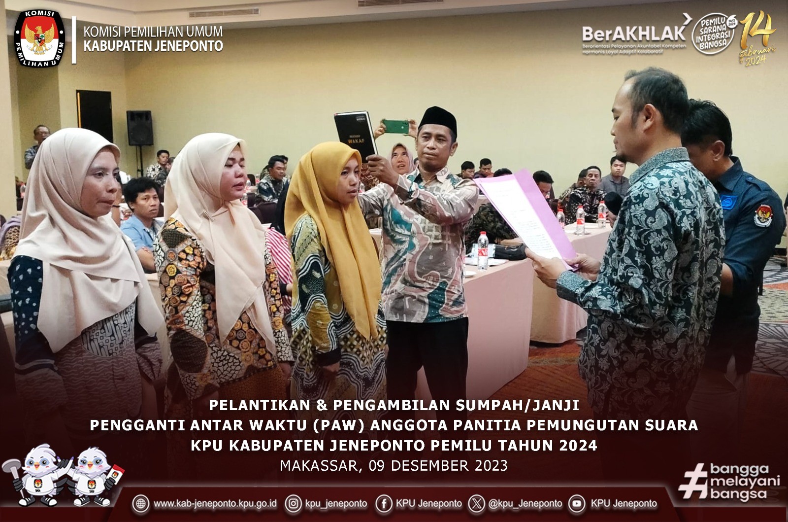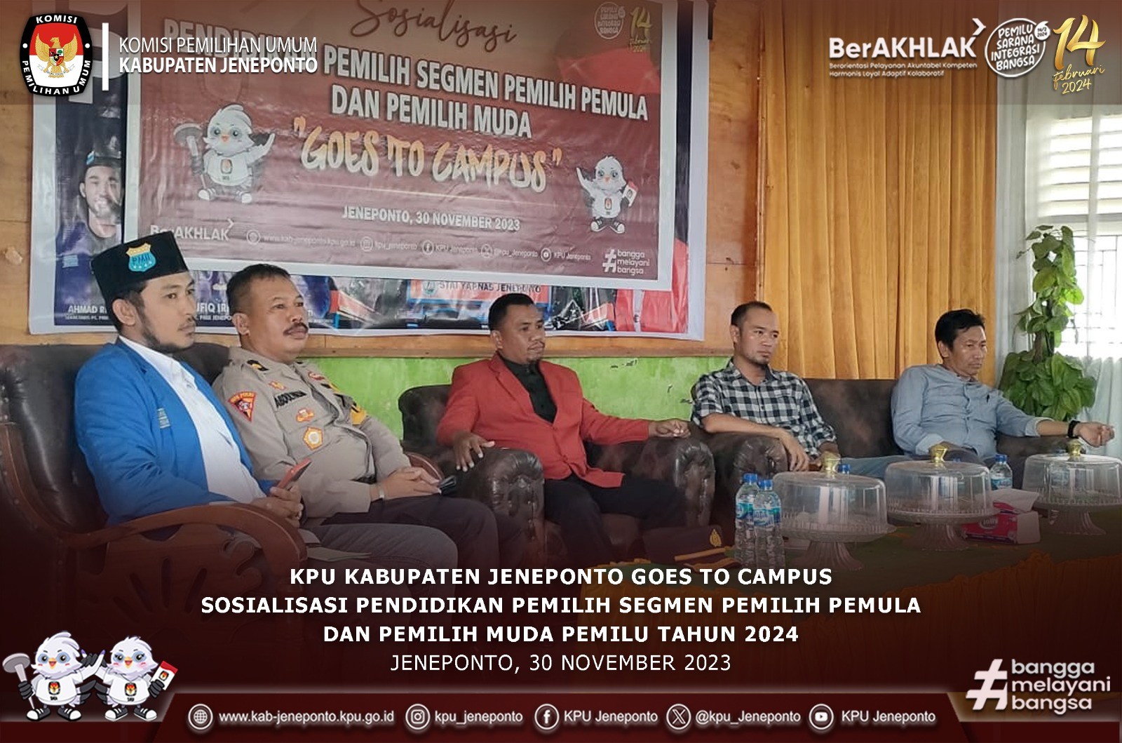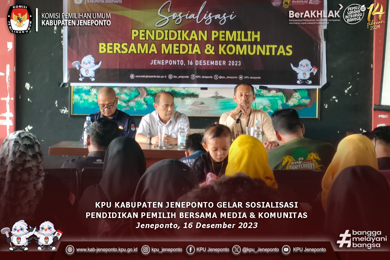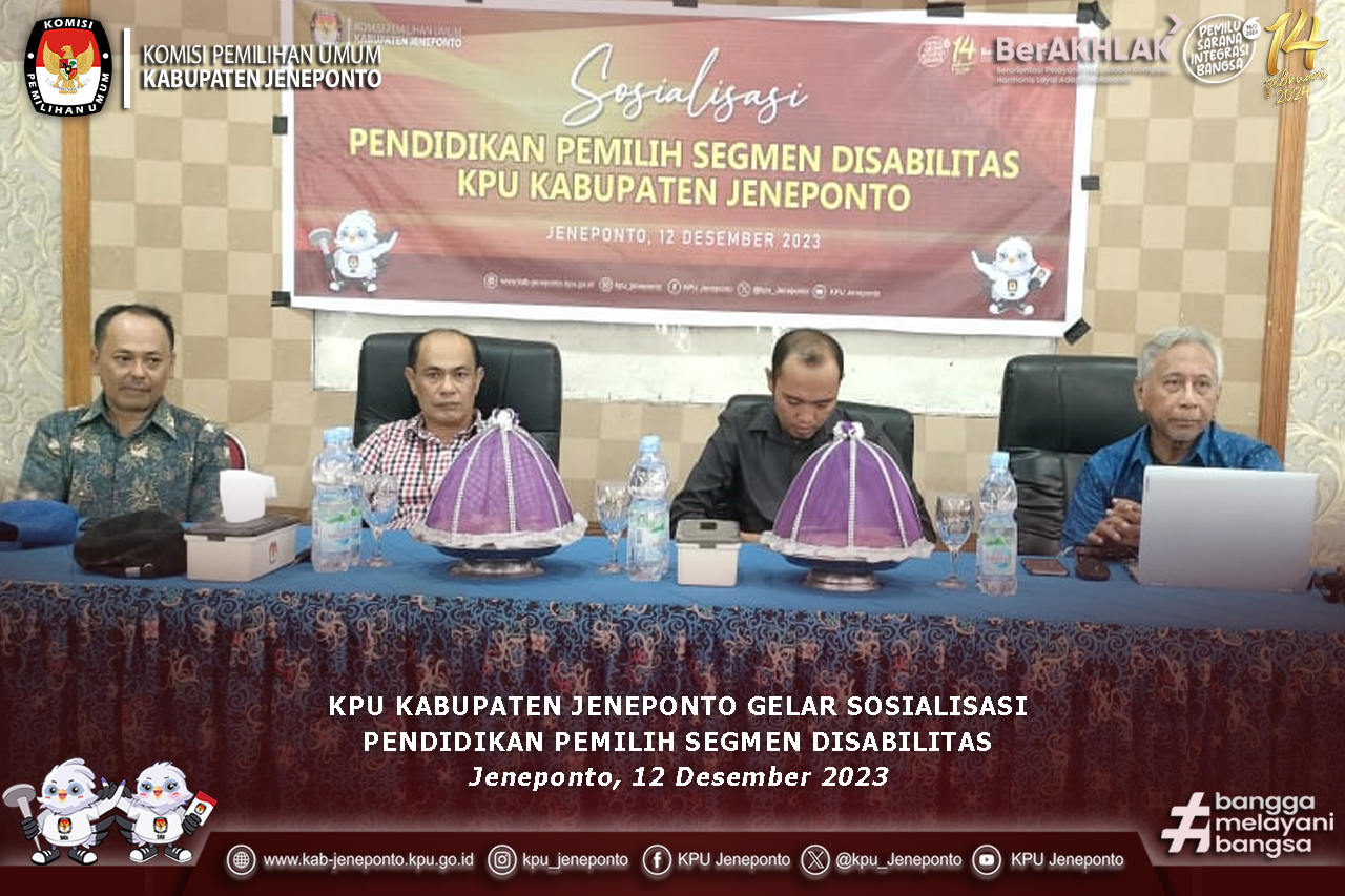 #TemanPemilih - Komisi Pemilihan Umum (KPU) Kabupaten Jeneponto menggelar Sosialisasi dan Pendidikan Pemilih melibatkan 100 orang pemilih dari segmen disabilitas untuk berpartisipasi dalam Pemilihan Umum (Pemilu) Tahun 2024 di ruang aula Balai Latihan Kerja (BLK) Jeneponto. Selasa (12/12/2023). Ketua KPU Kabupaten Jeneponto, Sapriadi S, dalam sambutannya partisipasi oleh disabilitas ini penting, disabilitas memiliki hak yang sama sebagai pemilih. “Hak akses yang aksesibel, memberikan suara yang rahasia, menjadi peserta dan penyelenggara Pemilu, serta mendapatkan informasi kepemiluan dan demokrasi,” Ujarnya Sementara Divisi Sosdiklih; Parmas dan SDM KPU Kabupaten Jeneponto, Azhari, menyatakan pemilih dari segmen disabilitas memiliki kepentingan dalam Pemilu. Diantaranya menyampaikan hak pilih, aksesibel, tidak sekedar menjadi objek, tanpa diskriminatif, dan lain sebagainya. Pertimbangan lainnya, partisipasi pemilih dari segmen disabilitas ini pada Pemilu Tahun 2019 di Jeneponto masih rendah. Untuk itu, KPU Jeneponto perlu memberikan sosialisasi dan pendidikan pemilih untuk segmen disabilitas ini. Disabilitas memiliki hak yang sama sebagai warga negara, disabilitas memiliki hak untuk paham tentang berbagai hal yang mempengaruhi kehidupan mereka dengan baik. "Selain itu mereka memiliki keterbatasan aktivitas yang secara tidak langsung berdampak pada kesadaran politik, dukungan keluarga terhadap keterlibatan disabilitas dalam pemilu masih relatif kurang, dan keterlibatan disabilitas dalam pemilu memotivasi pemilih lain,” jelas Azhari. Ia berharap setelah dilakukan kegiatan sosialisasi dan pendidikan pemilih pada segmen disabilitas ini, pemilih dari yang tidak tahu menjadi tahu. Kemudian ada perubahan sikap, dari antipati menjadi setuju dengan pemilu. “Kami berharap ada perubahan perilaku, dari yang tidak mau menggunakan hak pilih menjadi mau menggunakan hak pilihnya,”pungkasnya. Narasumber lainnya Ketua Perkumpulan Penyandang Disabilitas Indonesia (PPDI) Provinsi Sulawesi Selatan, Bambang Permadi memaparkan tentang Partisipasi Pemilih Penyandang Disabilitas pada Pemilu Tahun 2024. Usai pemaparan semua materi, acara dilanjutkan dengan tanya jawab interaktif bersama peserta. Hadir dalam acara tersebut Ketua dan anggota komisioner serta jajaran sekretariat KPU Jeneponto, juga dihadiri Ketua PPDI Provinsi Sulawesi Selatan serta Perwakilan TNI/Polri. #KPUMelayani #PemiluSerentak2024 #banggamelayanibangsa #TemanPemilih - Komisi Pemilihan Umum (KPU) Kabupaten Jeneponto menggelar Sosialisasi dan Pendidikan Pemilih melibatkan 100 orang pemilih dari segmen disabilitas untuk berpartisipasi dalam Pemilihan Umum (Pemilu) Tahun 2024 di ruang aula Balai Latihan Kerja (BLK) Jeneponto. Selasa (12/12/2023). Ketua KPU Kabupaten Jeneponto, Sapriadi S, dalam sambutannya partisipasi oleh disabilitas ini penting, disabilitas memiliki hak yang sama sebagai pemilih. “Hak akses yang aksesibel, memberikan suara yang rahasia, menjadi peserta dan penyelenggara Pemilu, serta mendapatkan informasi kepemiluan dan demokrasi,” Ujarnya Sementara Divisi Sosdiklih; Parmas dan SDM KPU Kabupaten Jeneponto, Azhari, menyatakan pemilih dari segmen disabilitas memiliki kepentingan dalam Pemilu. Diantaranya menyampaikan hak pilih, aksesibel, tidak sekedar menjadi objek, tanpa diskriminatif, dan lain sebagainya. Pertimbangan lainnya, partisipasi pemilih dari segmen disabilitas ini pada Pemilu Tahun 2019 di Jeneponto masih rendah. Untuk itu, KPU Jeneponto perlu memberikan sosialisasi dan pendidikan pemilih untuk segmen disabilitas ini. Disabilitas memiliki hak yang sama sebagai warga negara, disabilitas memiliki hak untuk paham tentang berbagai hal yang mempengaruhi kehidupan mereka dengan baik. "Selain itu mereka memiliki keterbatasan aktivitas yang secara tidak langsung berdampak pada kesadaran politik, dukungan keluarga terhadap keterlibatan disabilitas dalam pemilu masih relatif kurang, dan keterlibatan disabilitas dalam pemilu memotivasi pemilih lain,” jelas Azhari. Ia berharap setelah dilakukan kegiatan sosialisasi dan pendidikan pemilih pada segmen disabilitas ini, pemilih dari yang tidak tahu menjadi tahu. Kemudian ada perubahan sikap, dari antipati menjadi setuju dengan pemilu. “Kami berharap ada perubahan perilaku, dari yang tidak mau menggunakan hak pilih menjadi mau menggunakan hak pilihnya,”pungkasnya. Narasumber lainnya Ketua Perkumpulan Penyandang Disabilitas Indonesia (PPDI) Provinsi Sulawesi Selatan, Bambang Permadi memaparkan tentang Partisipasi Pemilih Penyandang Disabilitas pada Pemilu Tahun 2024. Usai pemaparan semua materi, acara dilanjutkan dengan tanya jawab interaktif bersama peserta. Hadir dalam acara tersebut Ketua dan anggota komisioner serta jajaran sekretariat KPU Jeneponto, juga dihadiri Ketua PPDI Provinsi Sulawesi Selatan serta Perwakilan TNI/Polri. #KPUMelayani #PemiluSerentak2024 #banggamelayanibangsa #TemanPemilih - Komisi Pemilihan Umum (KPU) Kabupaten Jeneponto menggelar Sosialisasi dan Pendidikan Pemilih melibatkan 100 orang pemilih dari segmen disabilitas untuk berpartisipasi dalam Pemilihan Umum (Pemilu) Tahun 2024 di ruang aula Balai Latihan Kerja (BLK) Jeneponto. Selasa (12/12/2023). Ketua KPU Kabupaten Jeneponto, Sapriadi S, dalam sambutannya partisipasi oleh disabilitas ini penting, disabilitas memiliki hak yang sama sebagai pemilih. “Hak akses yang aksesibel, memberikan suara yang rahasia, menjadi peserta dan penyelenggara Pemilu, serta mendapatkan informasi kepemiluan dan demokrasi,” Ujarnya Sementara Divisi Sosdiklih; Parmas dan SDM KPU Kabupaten Jeneponto, Azhari, menyatakan pemilih dari segmen disabilitas memiliki kepentingan dalam Pemilu. Diantaranya menyampaikan hak pilih, aksesibel, tidak sekedar menjadi objek, tanpa diskriminatif, dan lain sebagainya. Pertimbangan lainnya, partisipasi pemilih dari segmen disabilitas ini pada Pemilu Tahun 2019 di Jeneponto masih rendah. Untuk itu, KPU Jeneponto perlu memberikan sosialisasi dan pendidikan pemilih untuk segmen di