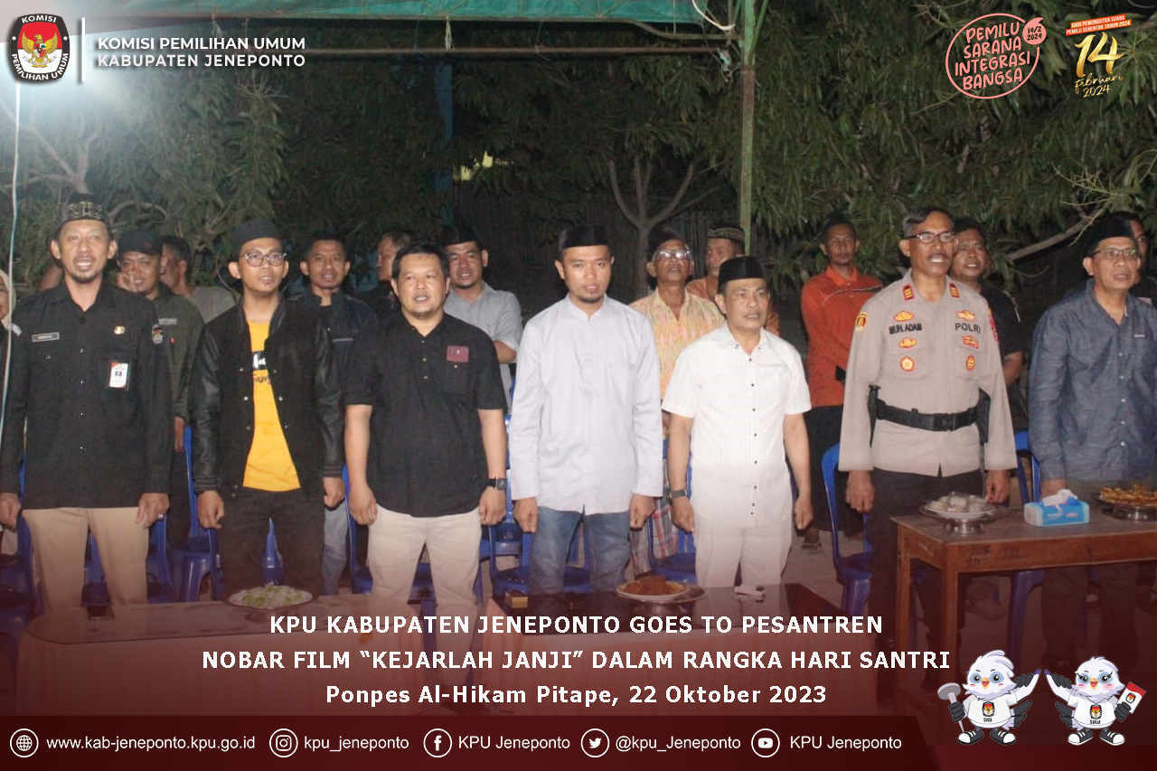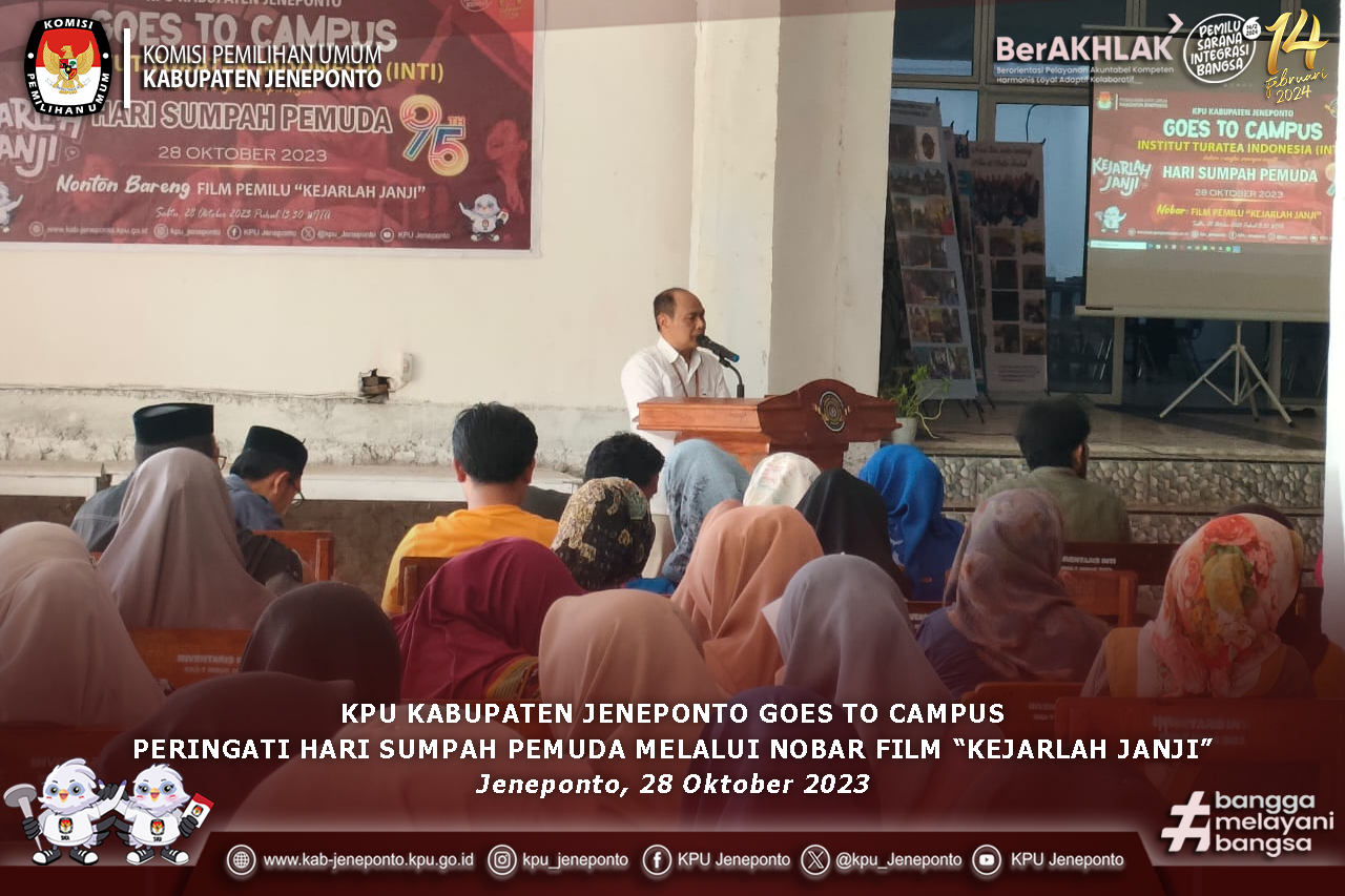 #TemanPemilih-Dalam rangka Hari Sumpah Pemuda, Komisi Pemilihan Umum (KPU) Kabupaten Jeneponto menggelar sosialisasi Goes To Campus pada Institut Turatea Indonesia (INTI) Jeneponto. Sabtu (28/10). Anggota KPU Kabupaten Jeneponto Divisi Sosdiklih dan Parmas, Azhari menyampaikan sosialisasi sekaligus nobar dilaksanakan untuk memperingati Hari Sumpah Pemuda ke-95 tahun. "Sosialisasi yang diselenggarakan agar pemilih muda khususnya mahasiswa mendapatkan pemahaman seputar pendidikan Pemilu 2024," Ungkapnya. Pada kesempatan yang sama, Azhari mengatakan kegiatan ini bertujuan untuk meningkatkan peran serta mahasiswa dan mahasiswi dalam pemilu 2024 mendatang, karena keterlibatan dari mahasiswa sangat diperlukan dan diharapkan dapat membantu KPU untuk menyosialisasikan pemilu 2024 mendatang. "Melalui NoBar Film "Kejarlah Janji' agar pemilih muda mendapatkan berbagai pesan yang disampaikan melalui film kejarlah jani. Seperti, menjadi pemilih yang cerdas, menangkal hoaks, dapat menangkal money politik, dan lain sebagainya. Sehingga para pemilih muda lebih paham dalam pemilu 2024 mendatang". Tuturnya. Selain itu, Prof. DR. H. Maksud Hakim, S.E.,S.Pd.,M.Pd selaku Rektor Institut Turatea Indonesia (INTI) Kabupaten Jeneponto, mengatakan kegiatan sosialisasi yang dilakukan oleh KPU Jeneponto sangat bermanfaat untuk memberikan edukasi bagi para mahasiswa. ”Kegiatan yang dilakukan oleh KPU Jeneponto ini memberikan manfaat yang sangat berguna untuk mahasiswa, sebab sosialisasi ini dapat menambahkan ilmu pengetahuan dalam pemilu nantinya," ujar Maksud. Kegiatan Nontong Bareng Film "Kejarlah Janji" dihadiri oleh Anggota KPU Kabupaten Jeneponto, Kepala Kesbangpol Jeneponto, Perwakilan Dandim 1425 Jeneponto, Perwakilan Polres Jeneponto, Rektor INTI dan Jajarannya serta civitas akademik, PPK, PPS, Staf Pelaksana Sekretariat KPU Kabupaten Jeneponto, dan Mahasiswa Magang UIN Makassar. Diharapkan dengan adanya kegiatan sosialisasi ini melalui NoBar Film "Kejarlah Janji' agar pemilih muda mendapatkan berbagai pesan yang disampaikan melalui film kejarlah jani. Seperti, menjadi pemilih yang cerdas, menangkal hoaks, dapat menangkal money politik, dan lain sebagainya. Sehingga para pemilih muda lebih paham dalam pemilu 2024 mendatang. #KPUMelayani #PemiluSerentak2024 #banggamelayanibangsa