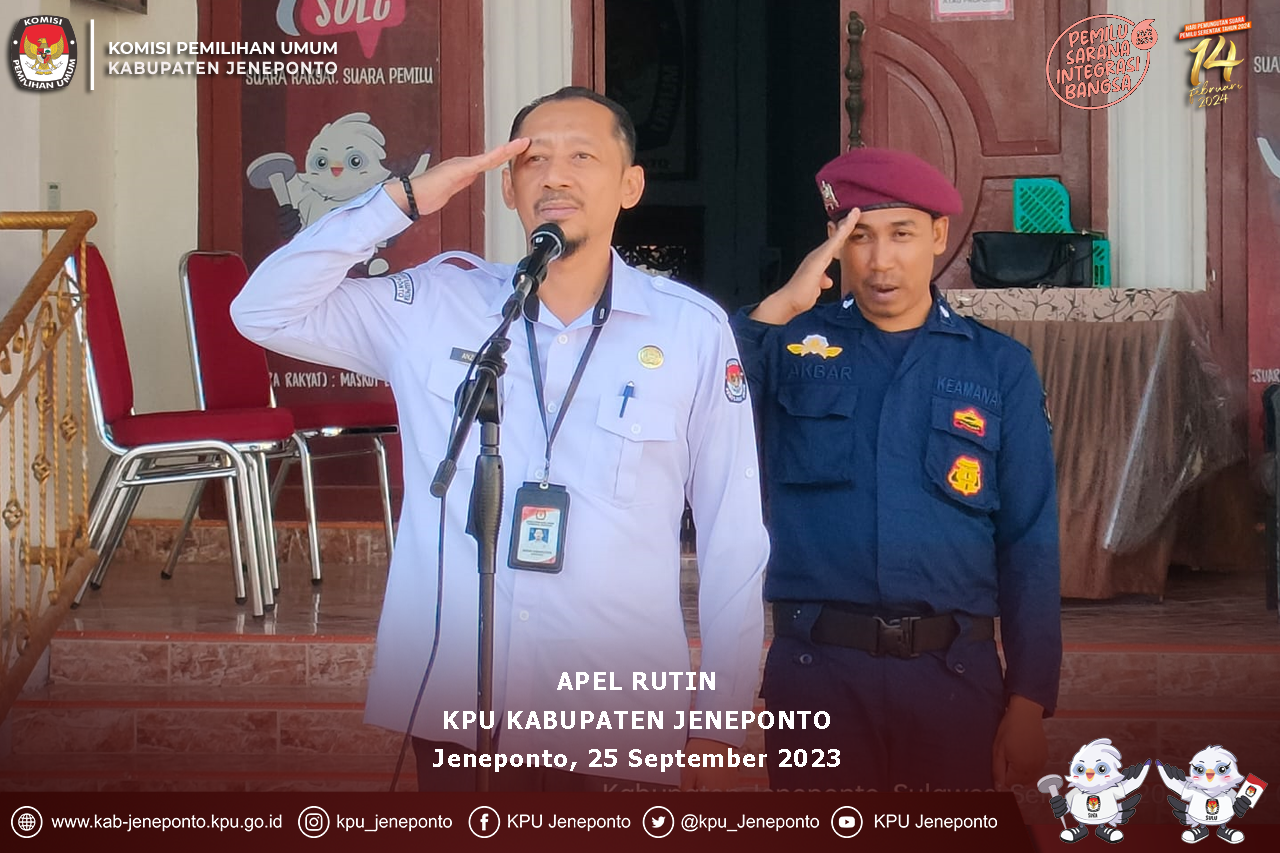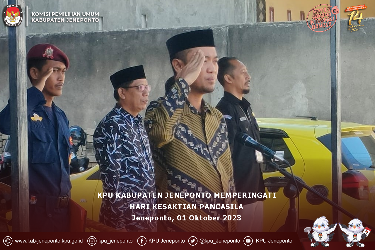 #TemanPemilih - Komisi Pemilihan Umum Kabupaten Jeneponto melaksanakan upacara peringatan Hari Kesaktian Pancasila yang jatuh pada tanggal 1 Oktober dan dilaksanakan di halaman kantor KPU Kabupaten Jeneponto. Minggu (1/10/2023) Upacara peringatan tersebut diikuti oleh Komisioner, Sekretaris, Kasubag, Pejabat Fungsional, Staf Pelaksana, Tenaga Pendukung Sekretariat KPU Kabupaten Jeneponto, Mahasiswa (i) Magang dan Siswa (i) Praktek Kerja Lapangan. Hari Kesaktian Pancasila merupakan pengingat bagaimana perjalanan Bangsa Indonesia dalam mempertahankan Ideologi Negara, termasuk penghormatan terhadap jasa para Pahlawan Revolusi yang gugur dalam peristiwa Gerakan 30 September atau lebih dikenal dengan sebutan G30S/PKI. Ada perjuangan panjang yang harus diingat oleh setiap generasi bangsa dan menjadi cerminan dalam menjalani kehidupan berbangsa dan bernegara. Ideologi Negara yang mengandung nilai-nilai luhur bangsa yang wajib diingat dan diimplementasikan di kehidupan sehari-hari oleh setiap generasi bangsa. #KPUMelayani #PemiluSerentak2024