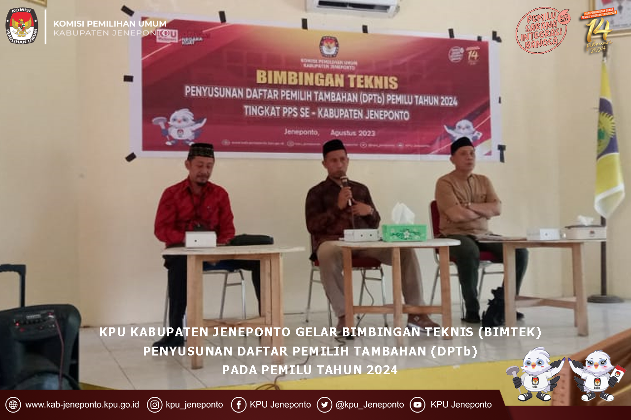 Bimtek itu dibuka oleh anggota KPU Provinsi Sulawesi Selatan Divisi SDM dan Litbang, Tasrif.SH, dan dihadiri Komisioner KPU Jeneponto Divisi Rendatin, Safaruddin, Sekretaris KPU Jeneponto, Anzar Hasanuddin, Kasubag Hukum dan SDM, Emmy Sartika, Kasubag Rendatin,Reskini, Tim Datin KPU Provinsi Sulawesi Selatan dan Staf Sekretariat KPU Kabupaten Jeneponto dengan peserta anggota PPK dan PPS Divisi Data se-Kecamatan Turatea, Kelara dan Rumbia.