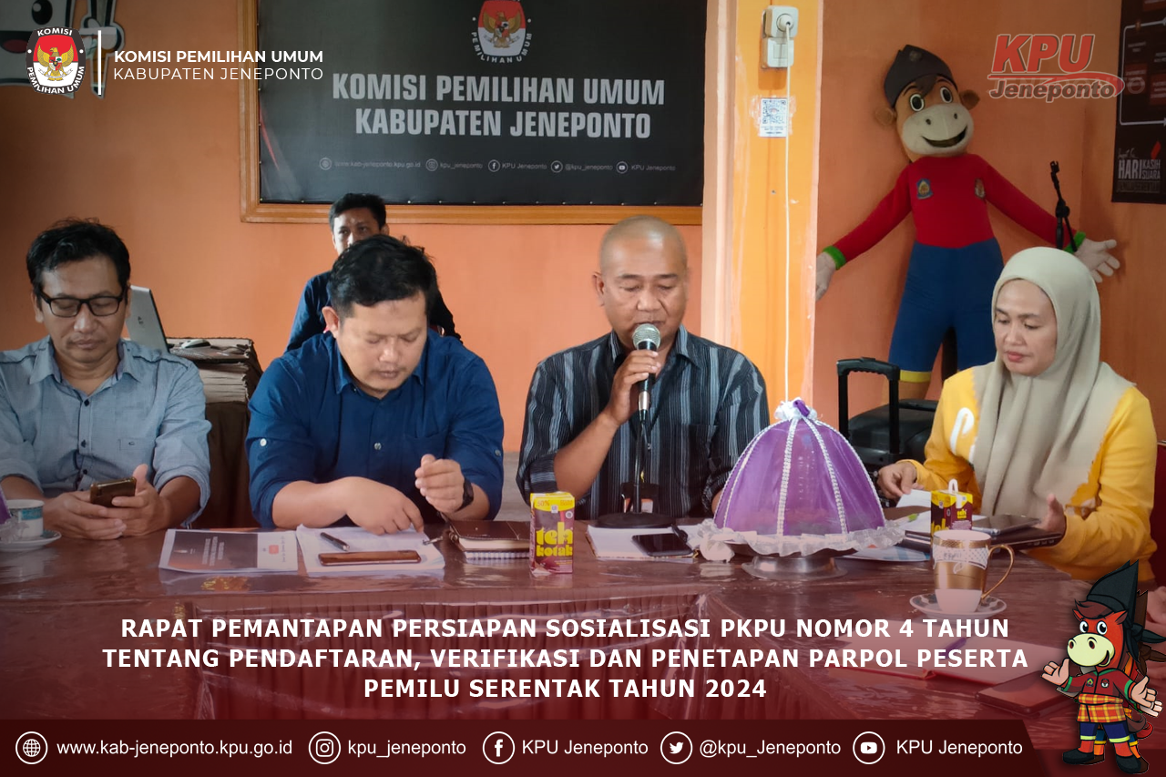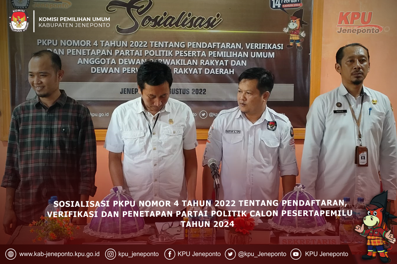 Ketua KPU Kabupaten Jeneponto Muhammad Alwi, dalam sambutannya saat membuka acara mengatakan mengapresiasi kepada peserta yang menyempatkan hadir dalam kegiatan ini. Tujuan kegiatan sosialisasi PKPU 4 Tahun 2022 untuk memberikan pengetahuan dan pemahaman kepada seluruh parpol terkait tahapan Pendaftaran, Verifikasi dan Penetapan Parpol Peserta pemilu 2024 dan Ini serentak di lakukan di Kabupaten/kota se-Sulsel.
