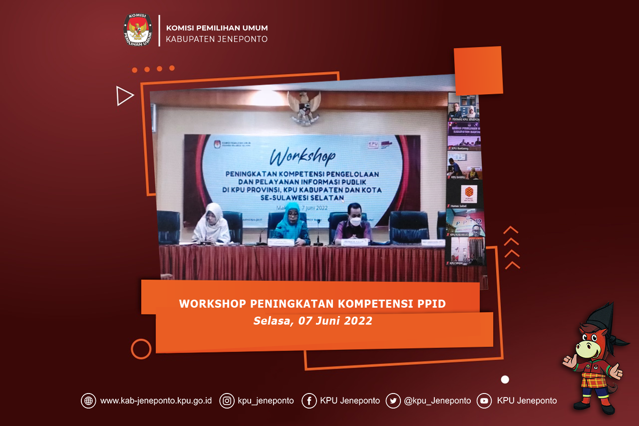 2. Workshop Pengelolaan dan Pelayanan Informasi Publik dalam pelaksanaan Tahapan Pemilu dan Pemilihan Tahun 2024 yang dilaksnakan oleh KPU Provinsi Sulawesi Selatan diikuti oleh Pejabat Pengelola Informasi dan Dokumentasi, Rahmat, SE, didampingi staf pelaksanan dan operator PPID KPU Kabupaten Jeneponto;