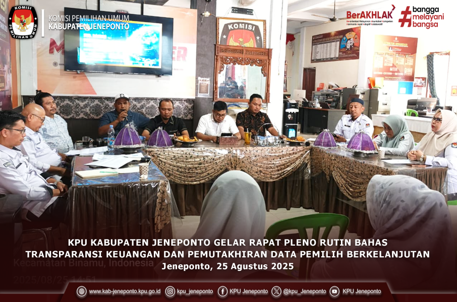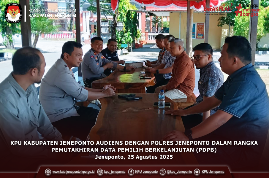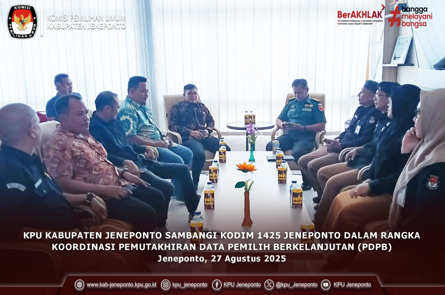 #TemanPemilih-Komisi Pemilihan Umum (KPU) Kabupaten Jeneponto melakukan kunjungan ke Komando Distrik Militer (Kodim) 1425 Jeneponto dalam rangka koordinasi Pemutakhiran Data Pemilih Berkelanjutan (PDPB). Rabu (27/08/2025) Kunjungan tersebut dipimpin langsung oleh Ketua dan Anggota KPU Kabupaten Jeneponto bersama jajaran Sekretariat, dan diterima oleh PASI INTEL Kodim 1425 Jeneponto, Lettu Muhtar beserta jajarannya. Agenda koordinasi ini bertujuan untuk memperkuat sinergi antara KPU dan TNI dalam mendukung tersedianya data pemilih yang akurat, mutakhir, dan komprehensif, khususnya terkait prajurit TNI yang memasuki usia pemilih maupun anggota keluarga yang memiliki hak pilih. Dalam kesempatan itu, Ketua KPU Kabupaten Jeneponto, Asming, menyampaikan pentingnya dukungan dan partisipasi aktif seluruh pihak, termasuk jajaran TNI, untuk memberikan data mutakhir yang relevan. Hal ini sejalan dengan amanat Undang-Undang bahwa pemutakhiran data pemilih dilakukan secara berkelanjutan demi menjamin hak konstitusional warga negara dalam setiap tahapan pemilu maupun pilkada. Sementara itu, pihak Kodim 1425 Jeneponto, Muhtar, menyambut baik kunjungan KPU Kabupaten Jeneponto dan menyatakan siap mendukung dan berkolaborasi dalam hal penyediaan Dukungan antara lain melalui penyampaian data yang berstatus Anggota TNI baru maupun Pensiun yang dapat membantu penyempurnaan data pemilih. Melalui koordinasi ini, KPU berharap kualitas daftar pemilih terus meningkat dan dapat digunakan secara valid pada pemilu maupun pilkada mendatang. #KPUMelayani