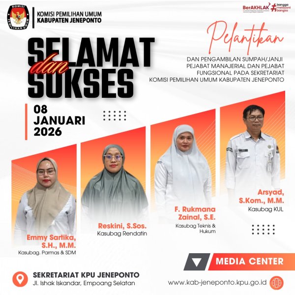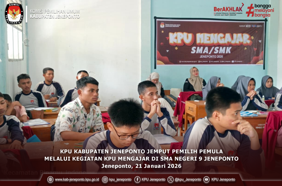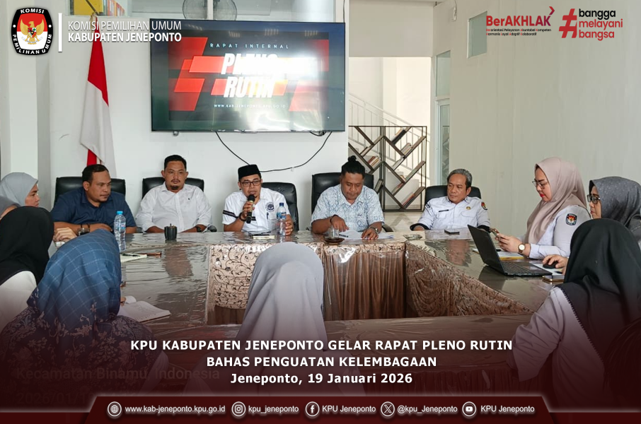 #TemanPemilih- Komisi Pemilihan Umum (KPU) Kabupaten Jeneponto menggelar rapat pleno rutin pada Senin, 19 Januari 2026, bertempat di Kantor KPU Kabupaten Jeneponto. Rapat pleno tersebut dipimpin langsung oleh Ketua KPU Kabupaten Jeneponto, Asming.S dan dihadiri oleh Anggota KPU Kabupaten Jeneponto, Sekretaris, Kasubag serta staf pelaksana. Rapat pleno rutin ini membahas sejumlah agenda penting, antara lain penguatan kelembagaan, peningkatan sinergitas antar unsur pimpinan dan sekretariat, serta optimalisasi kinerja lembaga dalam pelaksanaan tugas dan fungsi KPU. Dalam arahannya, Ketua KPU Kabupaten Jeneponto, Asming menekankan pentingnya menjaga soliditas dan kerja sama internal sebagai fondasi utama dalam membangun kelembagaan yang kuat. “Penguatan kelembagaan harus dibarengi dengan sinergitas dan komitmen bersama agar kinerja KPU Kabupaten Jeneponto semakin profesional, akuntabel, dan berintegritas,” ujarnya. Pada kesempatan yang sama, Sekretaris KPU Kabupaten Jeneponto, Lukman, dalam sambutannya, menyampaikan bahwa rapat pleno penguatan kelembagaan merupakan momentum penting untuk memperkuat sinergitas, soliditas, dan profesionalisme seluruh jajaran KPU Kabupaten Jeneponto. "Ia menegaskan bahwa kelembagaan yang kuat harus ditopang oleh tata kelola organisasi yang baik, kedisiplinan kerja, serta komitmen bersama dalam menjalankan tugas dan fungsi sesuai peraturan perundang-undangan,” ujarnya. Lebih lanjut, Lukman, mengajak seluruh unsur pimpinan, sekretariat, dan staf untuk terus meningkatkan koordinasi dan komunikasi internal, sehingga setiap program dan kegiatan dapat berjalan efektif dan tepat sasaran. Ia juga menekankan pentingnya menjaga integritas, akuntabilitas, serta kinerja lembaga dalam rangka mewujudkan penyelenggaraan pemilu yang berintegritas dan dipercaya oleh masyarakat. Melalui rapat pleno rutin ini, KPU Kabupaten Jeneponto berharap dapat menghasilkan langkah-langkah strategis dalam penguatan kelembagaan, sekaligus menjadi landasan untuk meningkatkan kualitas kinerja KPU Kabupaten Jeneponto ke depan serta memperkuat koordinasi internal, serta memberikan pelayanan terbaik kepada masyarakat sesuai dengan prinsip penyelenggaraan pemilu yang demokratis. #KPUMelayani