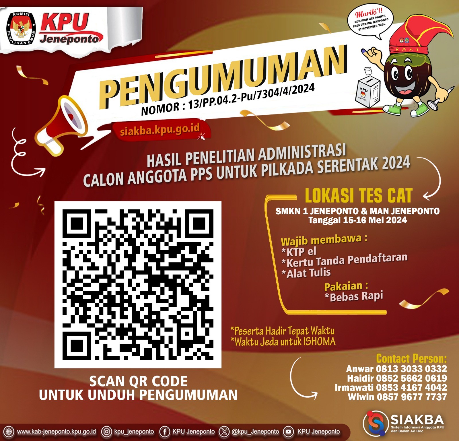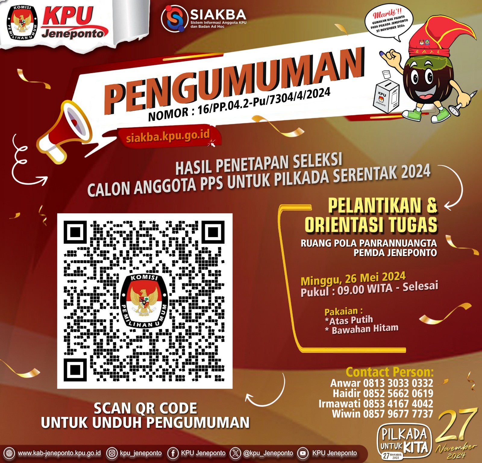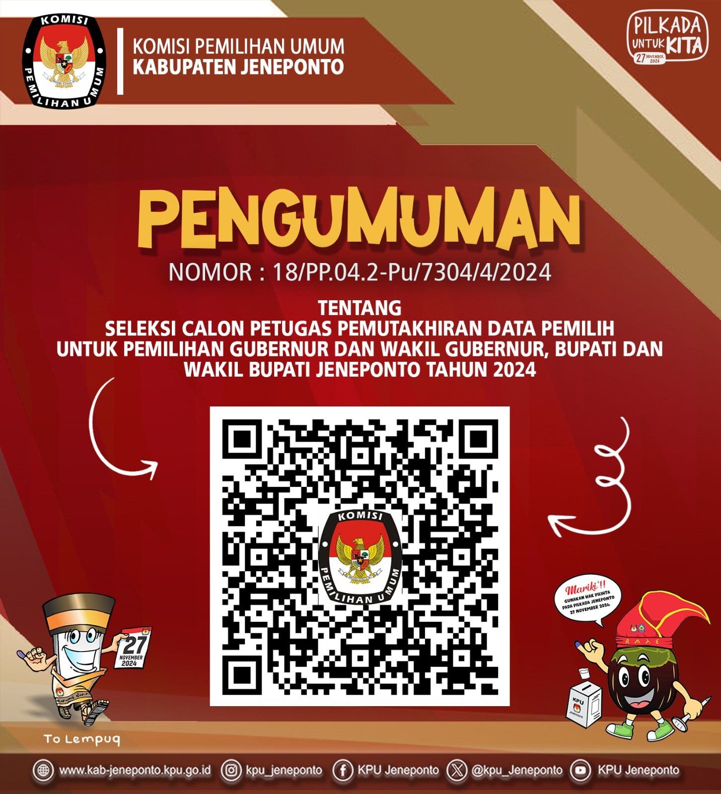 KPU Kabupaten Jeneponto menetapkan 339 Calon Anggota PPS Terpilih dalam Pemilihan Gubernur dan Wakil Gubernur, Bupati dan Wakil Bupati Kabupaten Jeneponto Tahun 2024. Bagi Calon Anggota PPS yang dinyatakan TERPILIH diwajibkan untuk hadir dalam pelantikan, pengambilan sumpah/janji dan penandatanganan pakta integritas, serta dilanjutkan dengan Bimbingan Teknis dan Pengarahan yang akan dilaksanakan sebagaimana jadwal yang tertera dalam pengumuman. Pengumuman dapat diunduh melalui Link berikut: KPU Kabupaten Jeneponto menetapkan 339 Calon Anggota PPS Terpilih dalam Pemilihan Gubernur dan Wakil Gubernur, Bupati dan Wakil Bupati Kabupaten Jeneponto Tahun 2024. Bagi Calon Anggota PPS yang dinyatakan TERPILIH diwajibkan untuk hadir dalam pelantikan, pengambilan sumpah/janji dan penandatanganan pakta integritas, serta dilanjutkan dengan Bimbingan Teknis dan Pengarahan yang akan dilaksanakan sebagaimana jadwal yang tertera dalam pengumuman. Pengumuman dapat diunduh melalui Link berikut: .DOWNLOAD PENGUMUMAN atau melalui Scan QR Code tertera. #KPUMelayani #PemilihanSerentak2024 atau melalui Scan QR Code tertera. #KPUMelayani #PemilihanSerentak2024