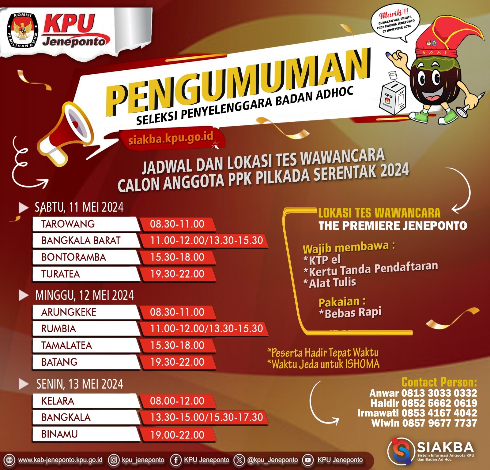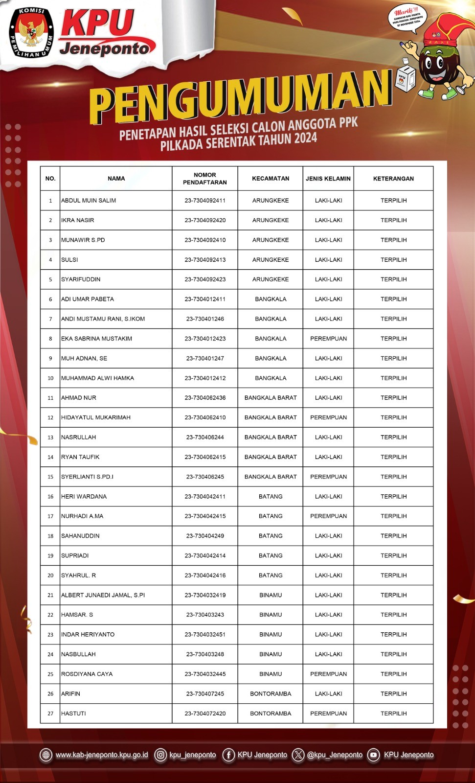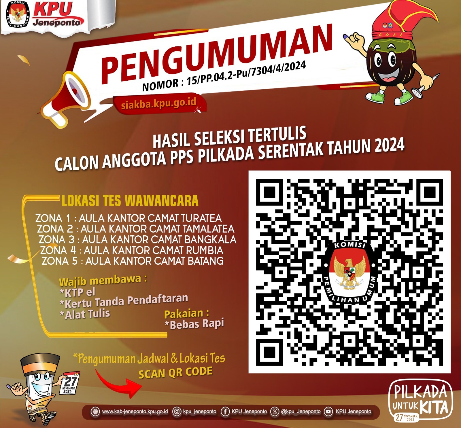 KPU Kabupaten Jeneponto menetapkan 339 Calon Anggota PPS Terpilih dalam Pemilihan Gubernur dan Wakil Gubernur, Bupati dan Wakil Bupati Kabupaten Jeneponto Tahun 2024. Bagi Calon Anggota PPS yang dinyatakan TERPILIH diwajibkan untuk hadir dalam pelantikan, pengambilan sumpah/janji dan penandatanganan pakta integritas, serta dilanjutkan dengan Bimbingan Teknis dan Pengarahan yang akan dilaksanakan sebagaimana jadwal yang tertera dalam pengumuman. Pengumuman dapat diunduh melalui Link berikut: KPU Kabupaten Jeneponto menetapkan 339 Calon Anggota PPS Terpilih dalam Pemilihan Gubernur dan Wakil Gubernur, Bupati dan Wakil Bupati Kabupaten Jeneponto Tahun 2024. Bagi Calon Anggota PPS yang dinyatakan TERPILIH diwajibkan untuk hadir dalam pelantikan, pengambilan sumpah/janji dan penandatanganan pakta integritas, serta dilanjutkan dengan Bimbingan Teknis dan Pengarahan yang akan dilaksanakan sebagaimana jadwal yang tertera dalam pengumuman. Pengumuman dapat diunduh melalui Link berikut: .DOWNLOAD PENGUMUMAN atau melalui Scan QR Code tertera. #KPUMelayani #PemilihanSerentak2024 atau melalui Scan QR Code tertera. #KPUMelayani #PemilihanSerentak2024